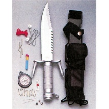 This Survival Knife features a 7 1/2" stainless steel blade, hollow steel handle, compass, survival accessories, nylon & plastic sheath, with pouches, sharpening stone (matches not included).